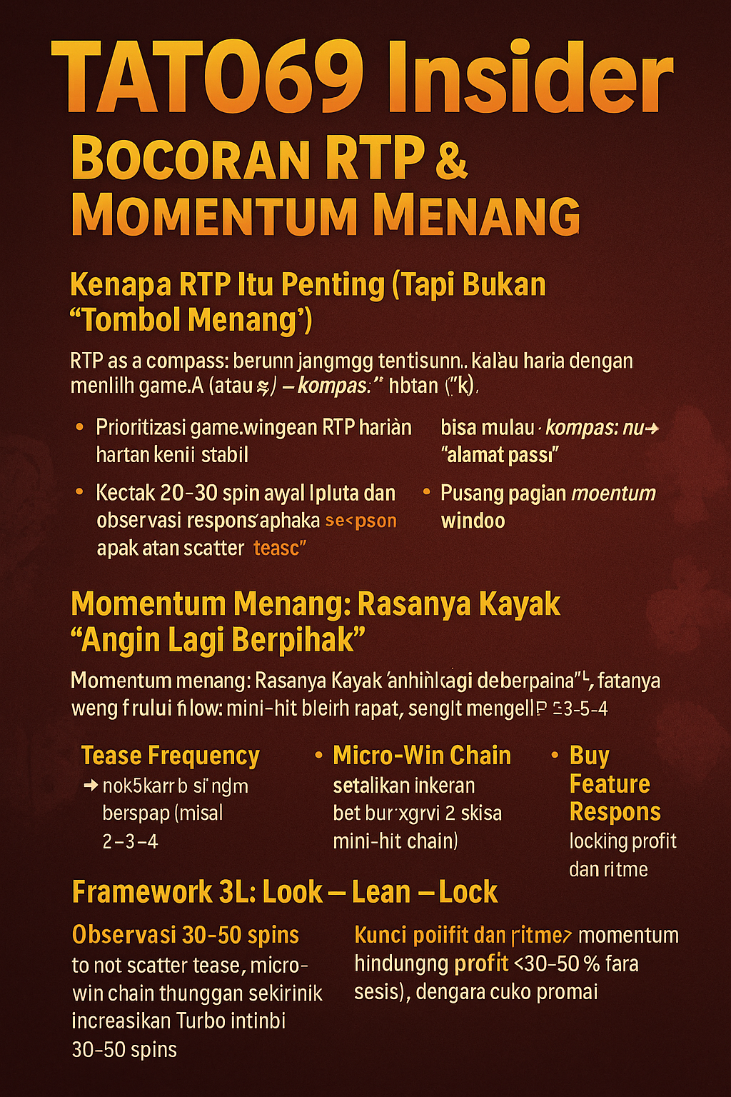 Menjadi insider di TATO69 itu bukan soal punya “bocoran rahasia” yang magic, melainkan cara membaca RTP sebagai kompas dan momentum sebagai angin. Ketika kompas dan angin searah, barulah kamu buka layar, bikin blok spin, dan kunci profit dengan disiplin. Ingat: keberuntungan memang bagian dari permainan, tapi rutinitas, catatan, dan manajemen sesi adalah pembeda utama antara sekadar putar-putar dan pemain yang tahu kapan harus tekan gas, angkat kaki, atau parkir hasil.